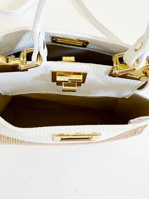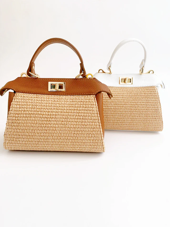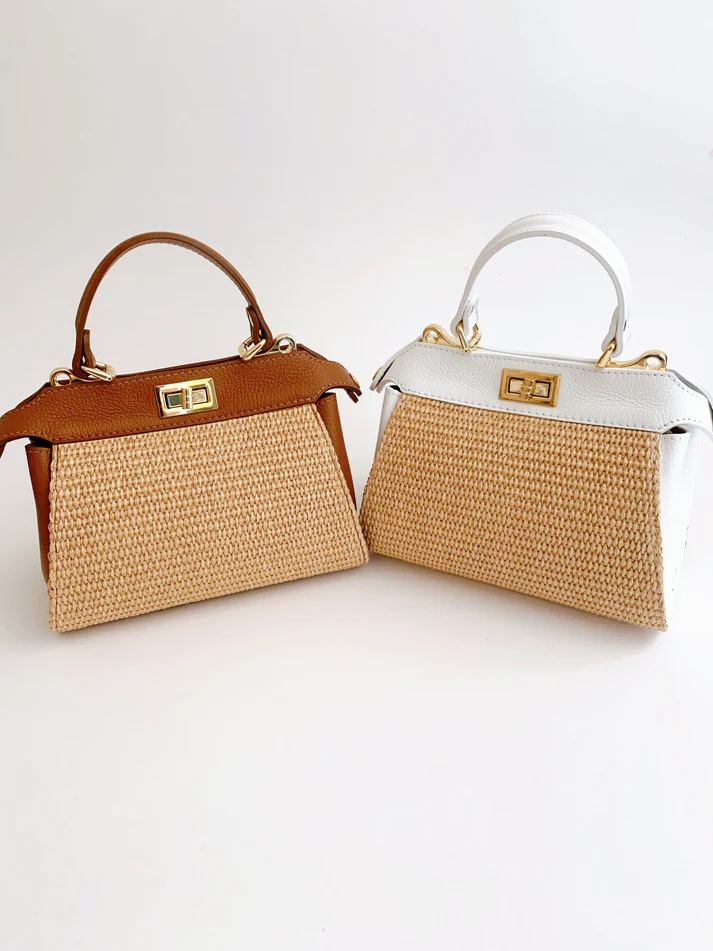These raffia flip lock tote bags are a classic silhouette that can easily go from day to night and everything in between. The soft pebbled leather pairs easily with any wardrobe or style. Currently offered in these 3 colors: Nude, White, and Light Brown.